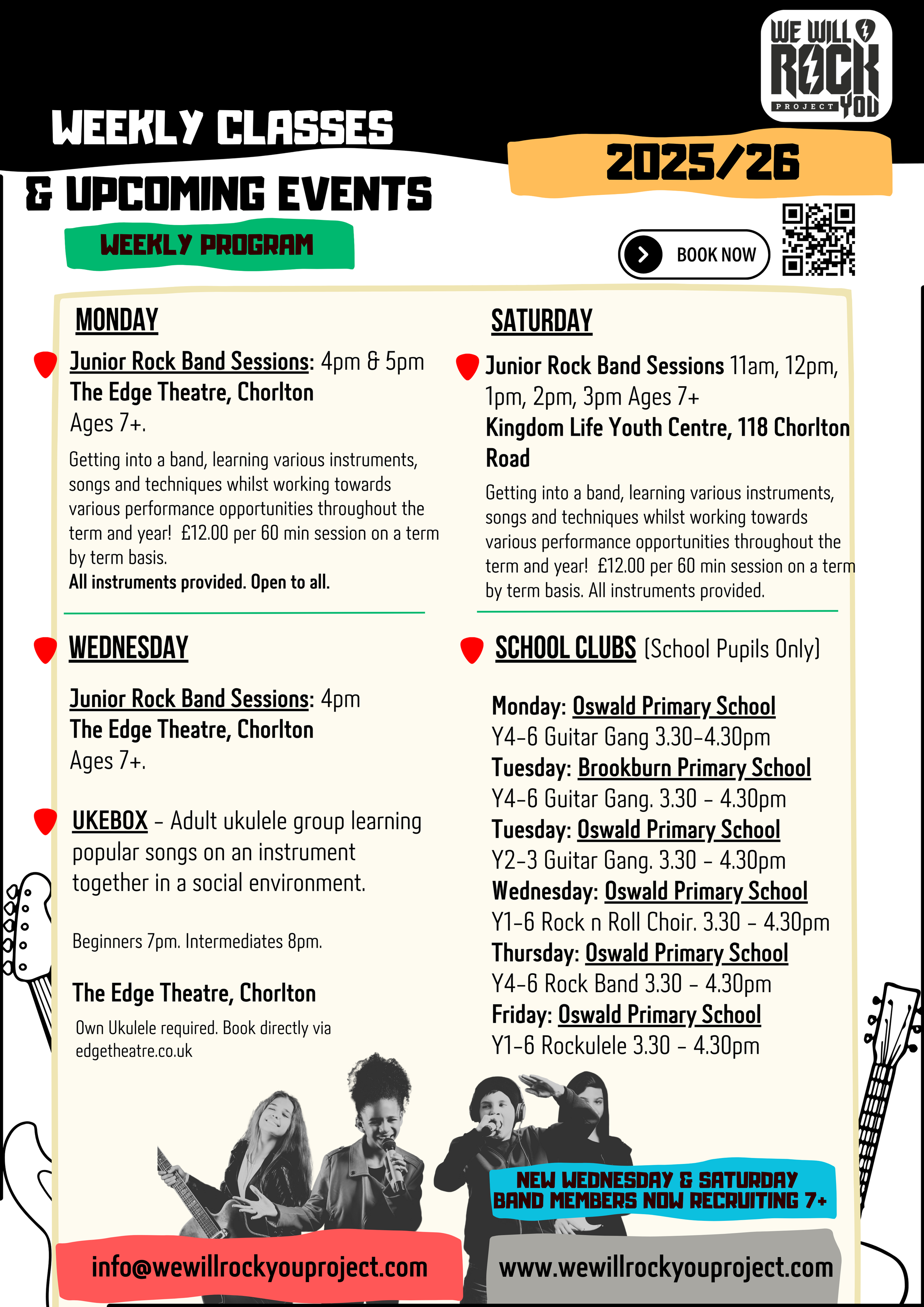 The project utilises various electric and acoustic instruments including electric guitars, bass guitars, keyboards, acoustic guitars, drum kits, vocals and percussion achieving an overall full band experience covering modern and classic songs including tracks from the Rockschool 2018 syllabus with later grades contributing towards GCSE & UCAS points. The project also run one day workshops, 1-2-1 tuition for pupils wishing to take their instrument to the next level and master class sessions with UK industry professionals.